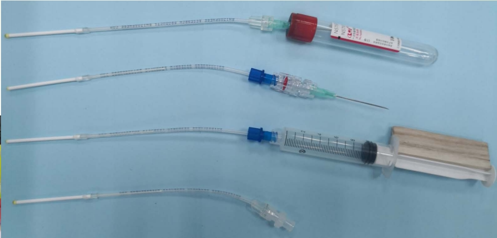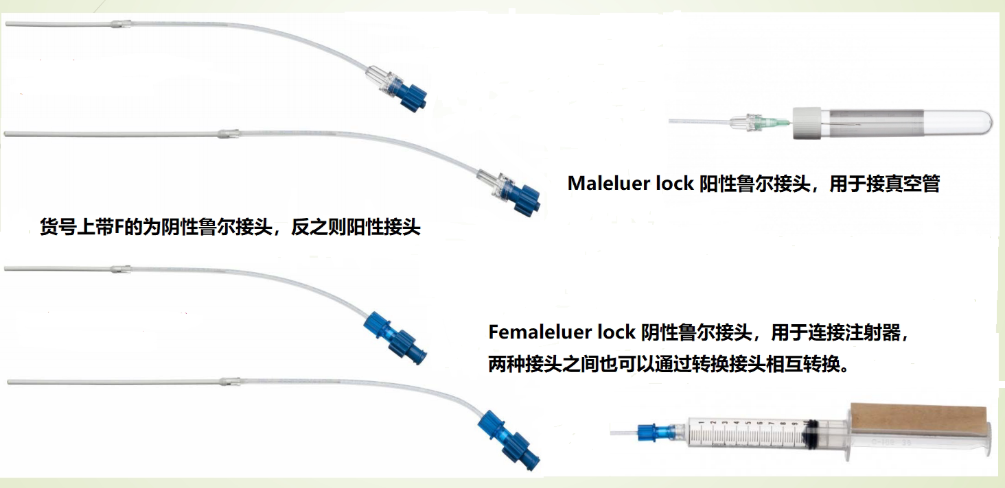 取樣器末端兩種接頭:陽性魯爾接頭接真空管,陰性魯爾接頭接注射器 如圖示